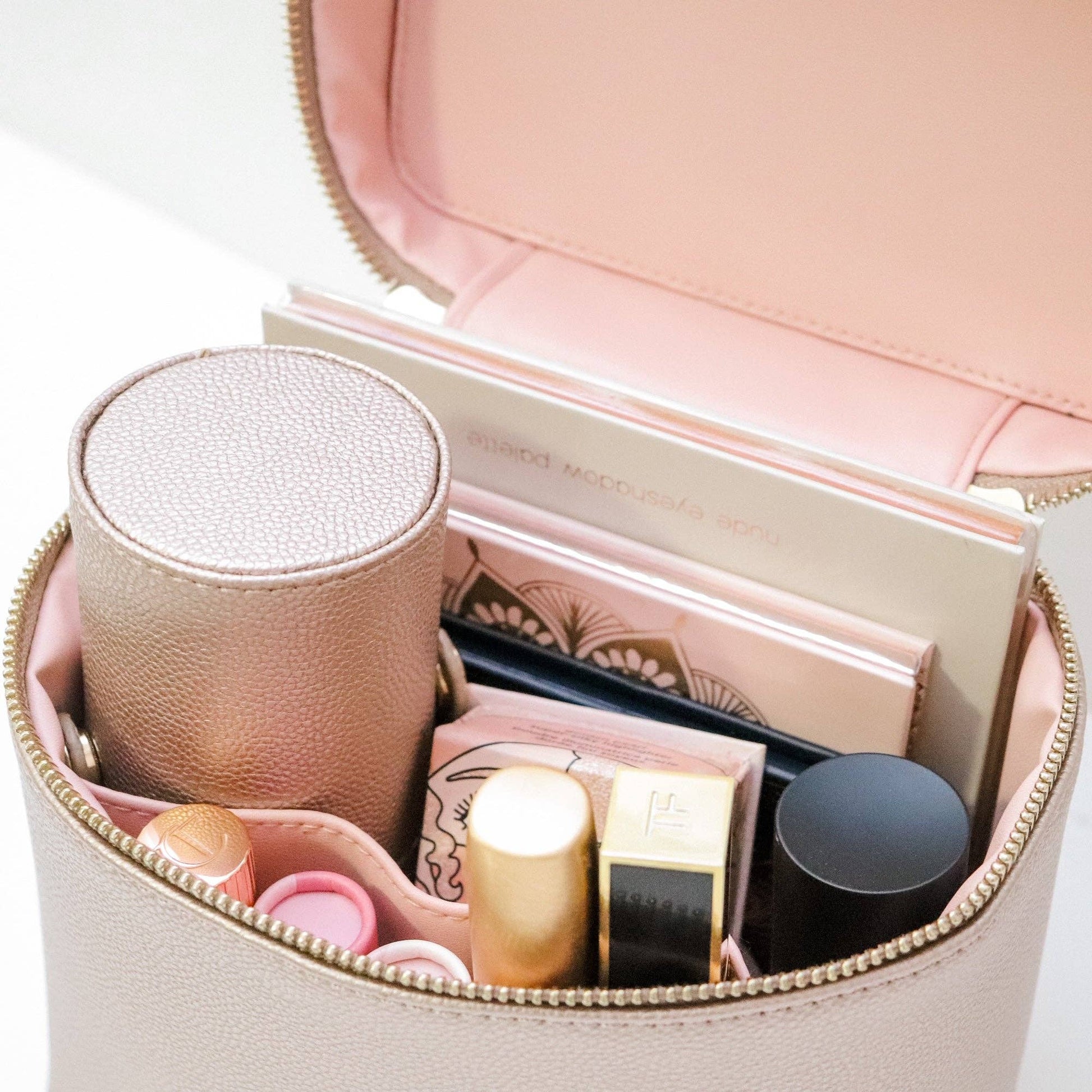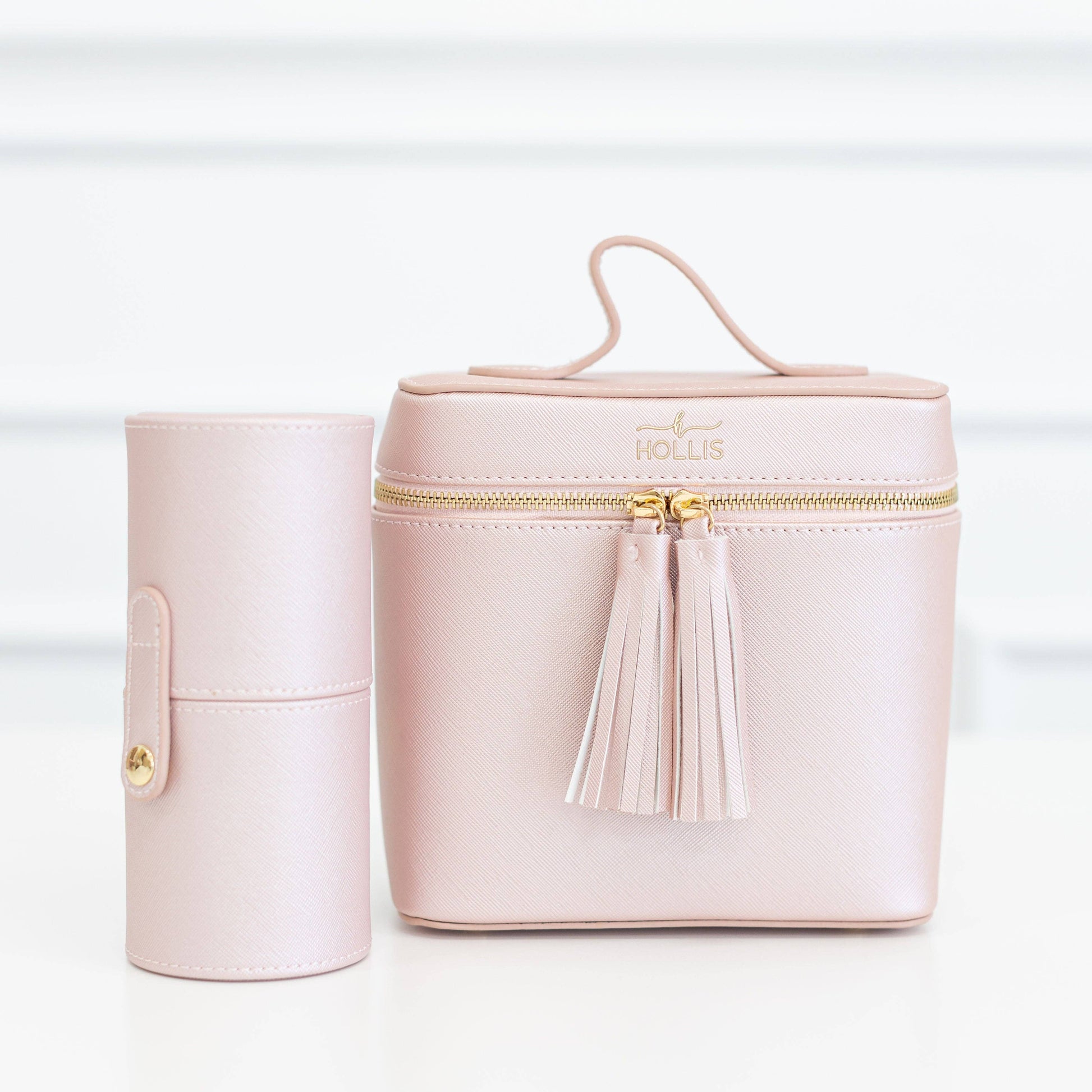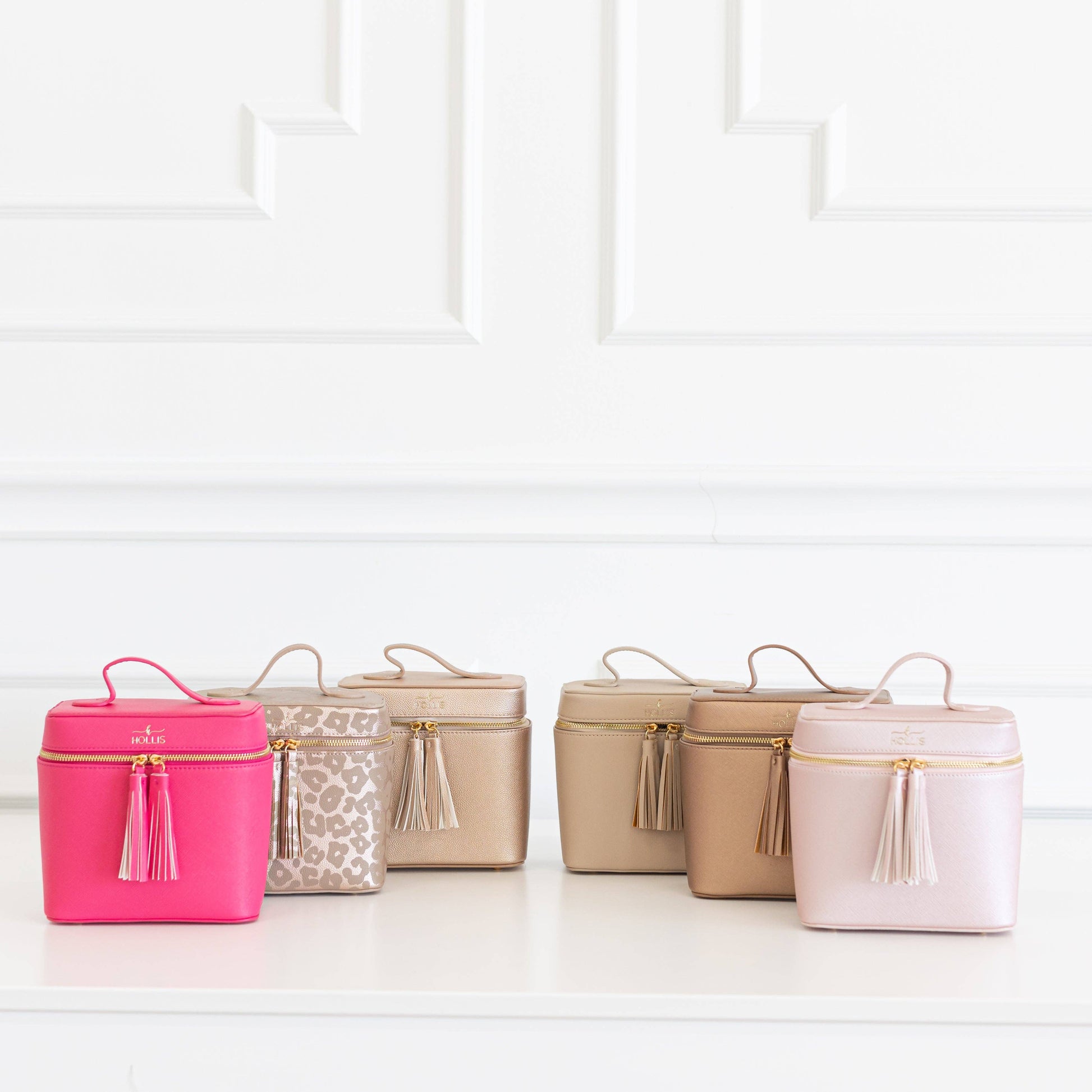 Coming in six beautiful color options: Rose Gold, Leopard, Blush, and Hot Pink. Comes included with a mini brush holder that could be used for small brushes, beauty blenders or lip products! Please note: Due to the one-of-a-kind nature of our products, exact color patterns may vary slightly from the image shown. 8x4x7