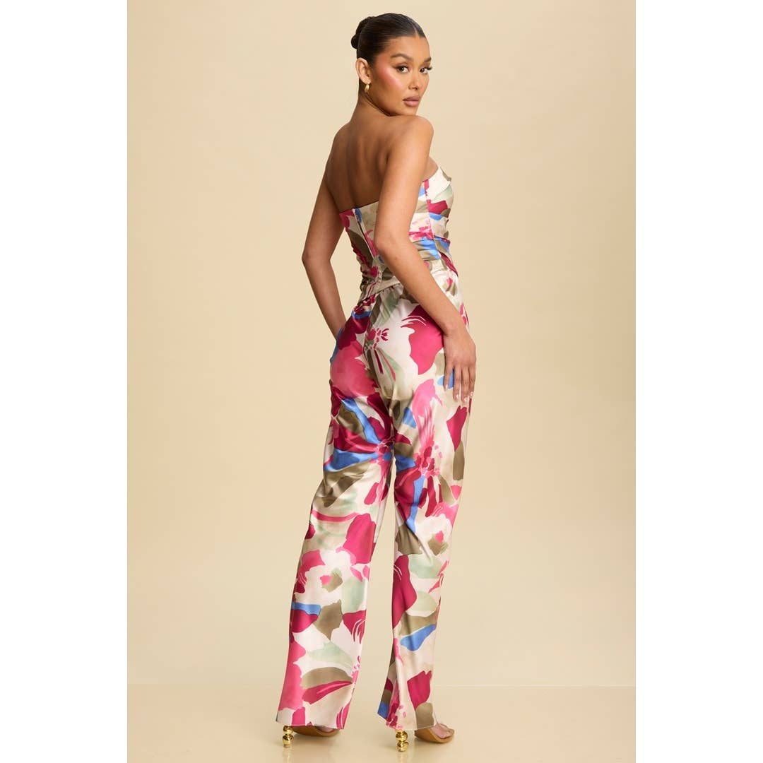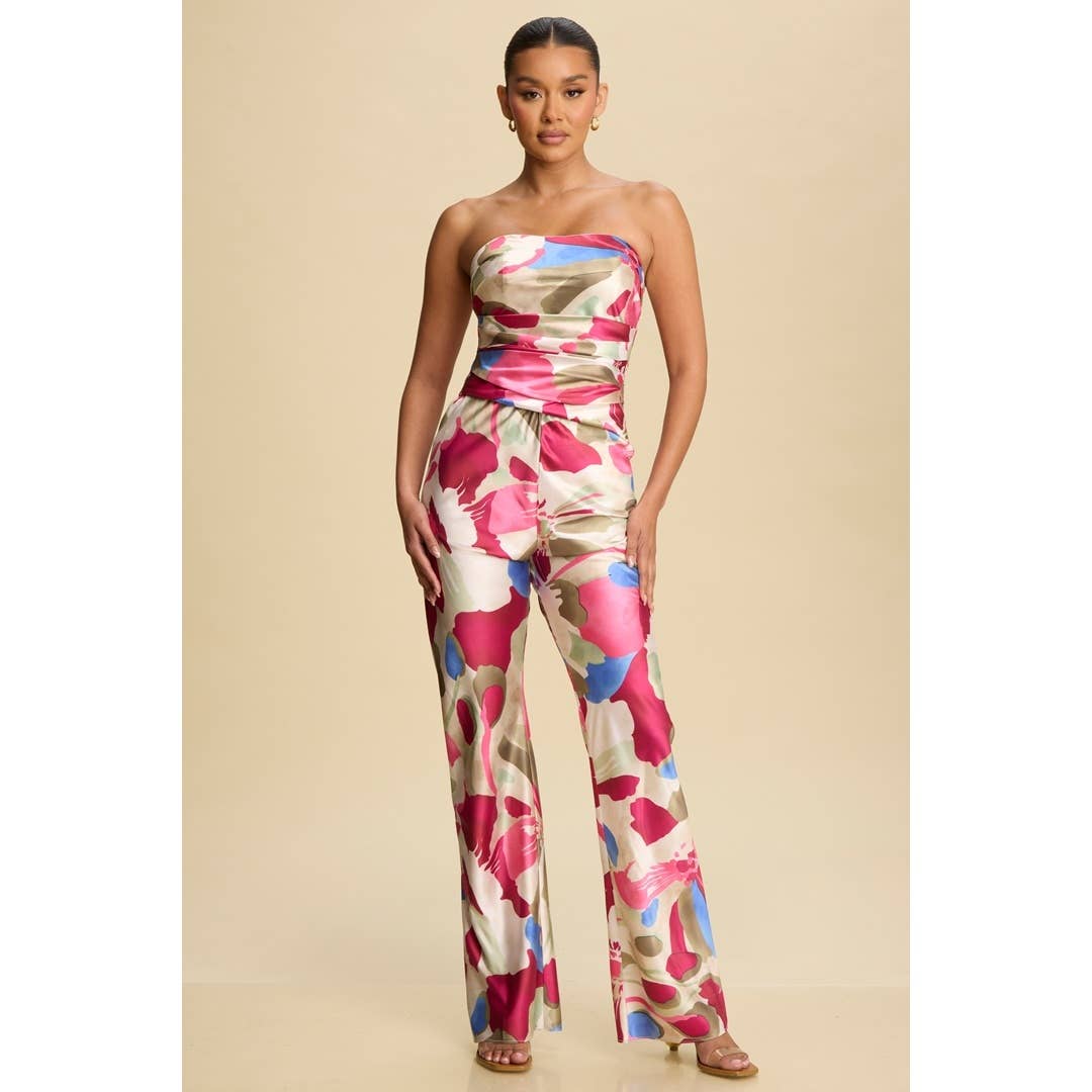 Our love of 2 piece sets is only growing with the Palos Satin Pant Set! The draped strapless top has structure for support and a back zipper, as well as a trendy asymmetric hem and is paired with a simple elastic waistband wide leg pant.
