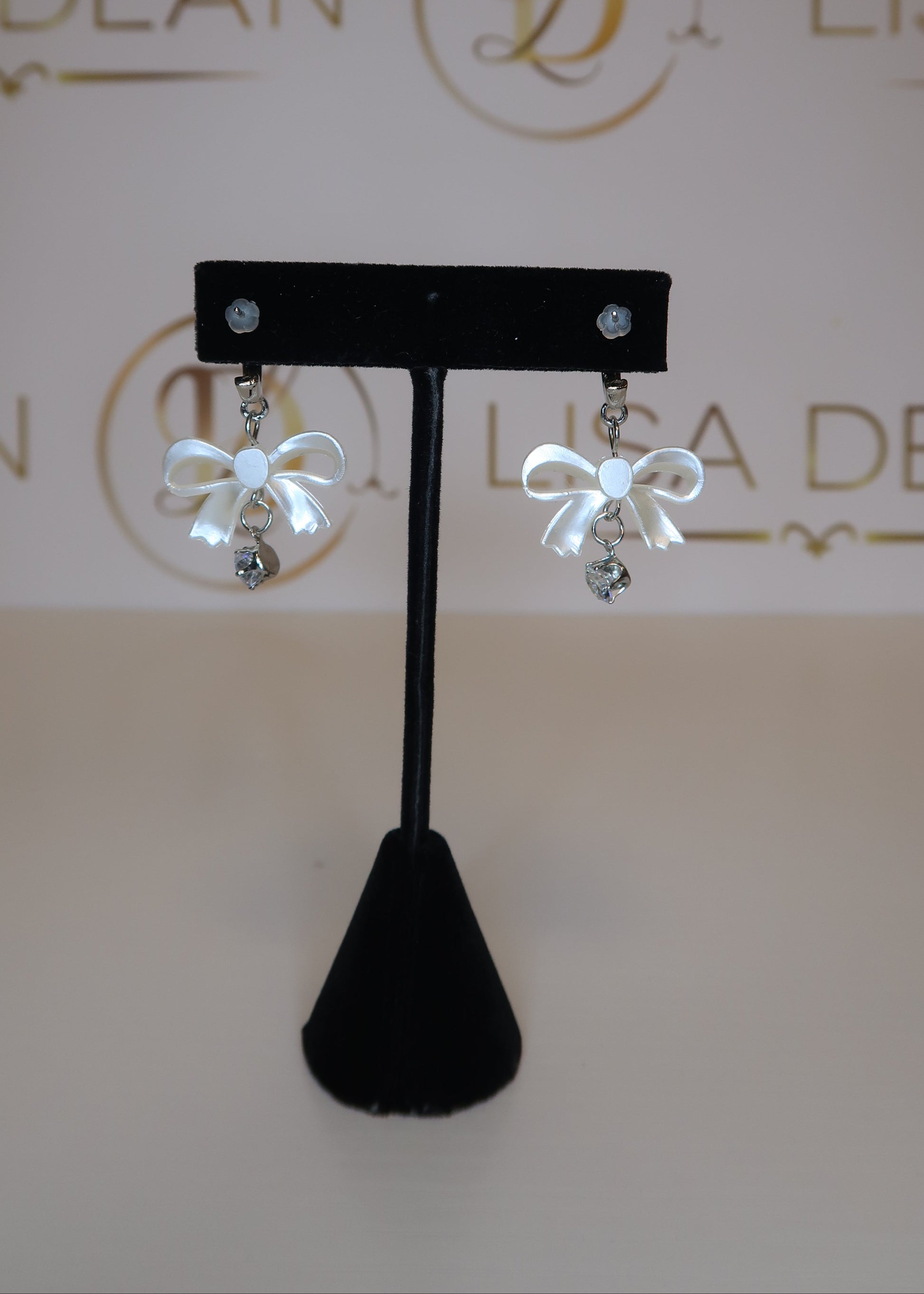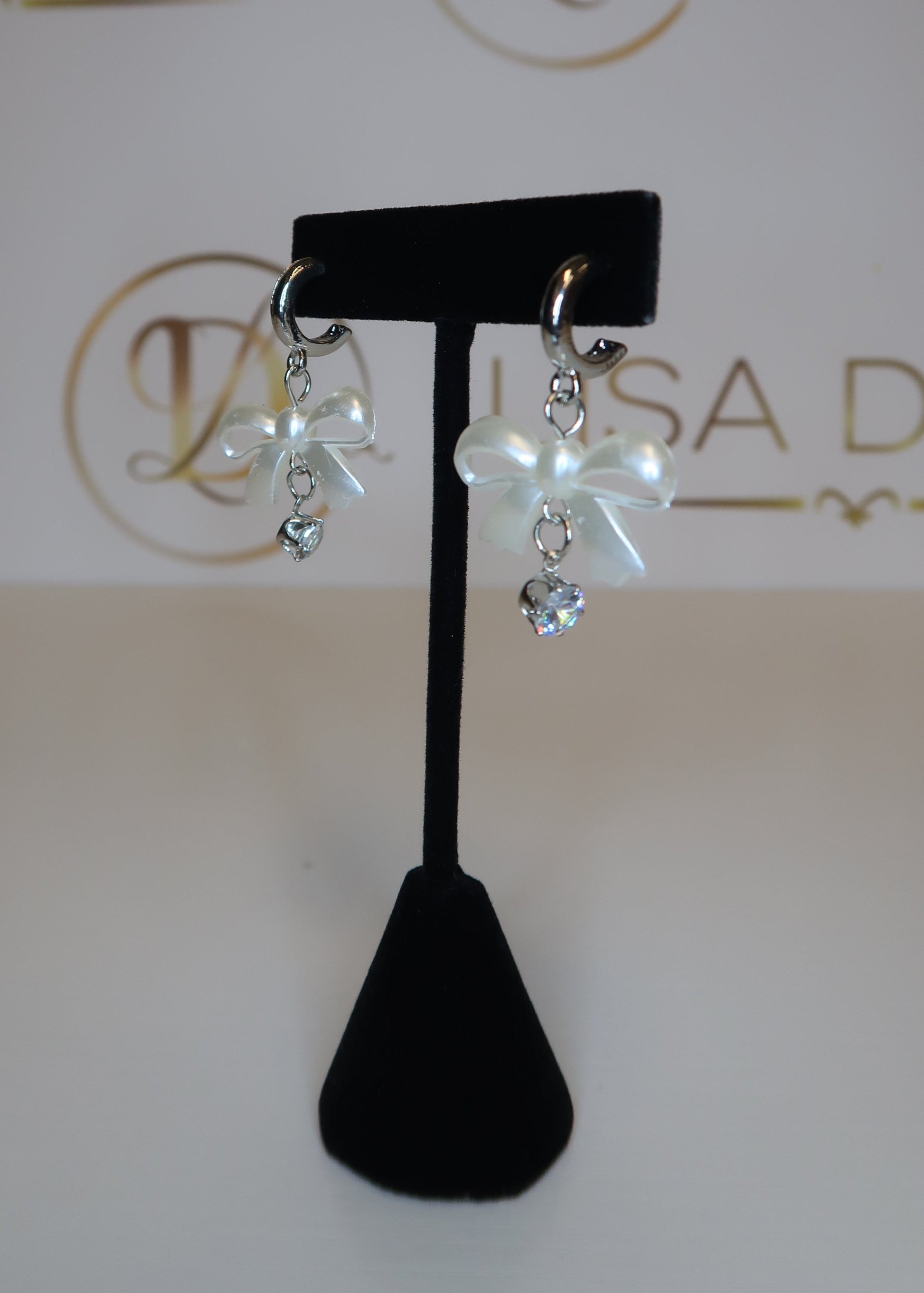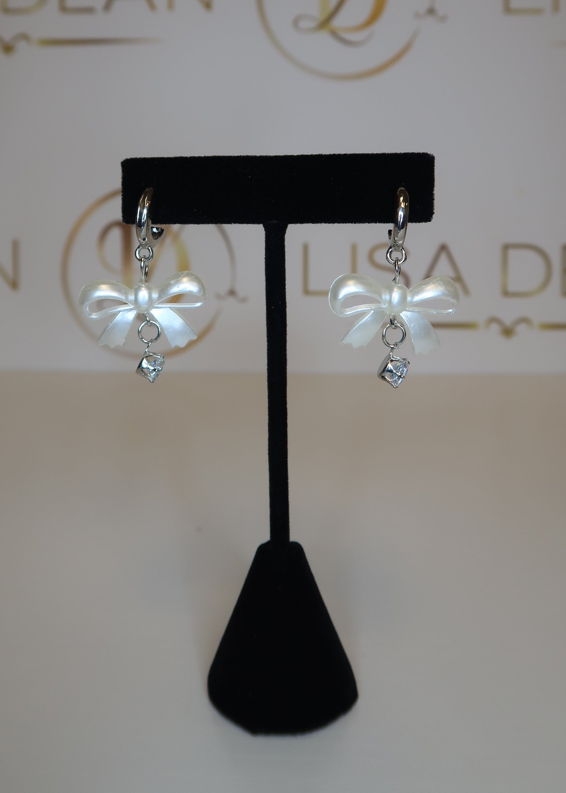 Add a touch of glam with these Silver Pearly Bow Rhinestone Drop Huggies! Approx. 1 1/2" in length.