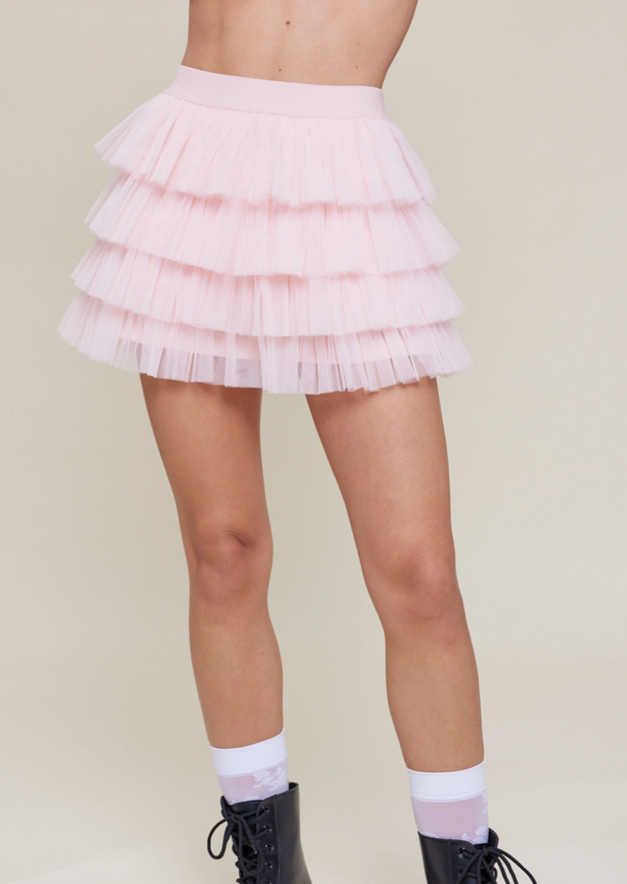 This skort is made from a pink sheer mesh material. It has built in shorts for lining. The waistband is elastic and it has a tiered ruffle shape.