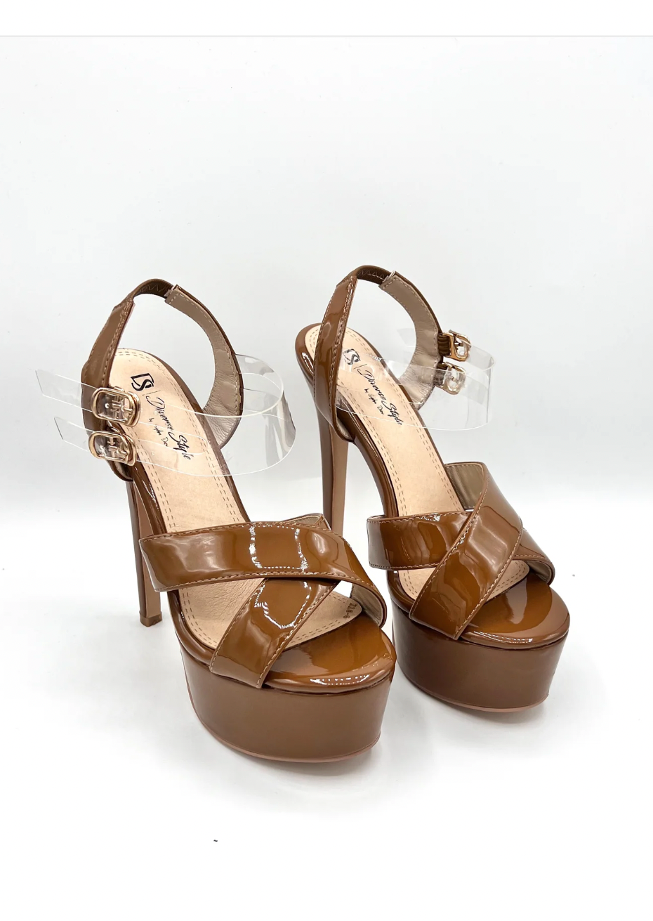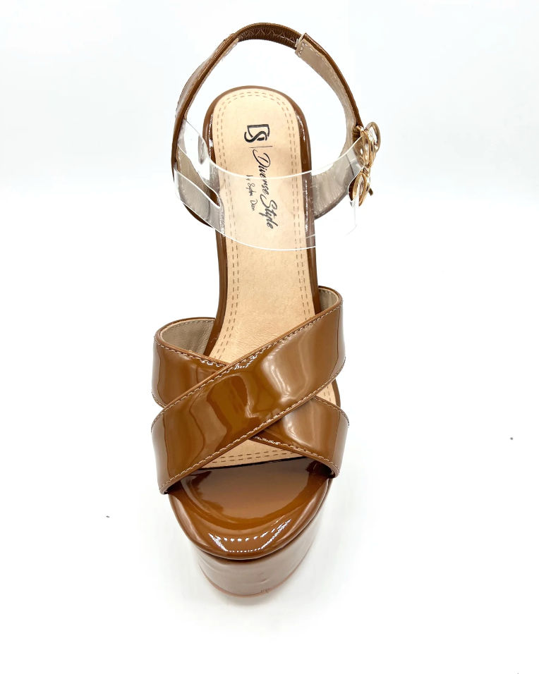 Brown genuine patent leather, matches light to medium brown skin tones, shoe will elongate leg and give extra height, lucite ankle strap, 6 1/2 inch heel, extra cushion for comfort to endure hours of standing -True to size