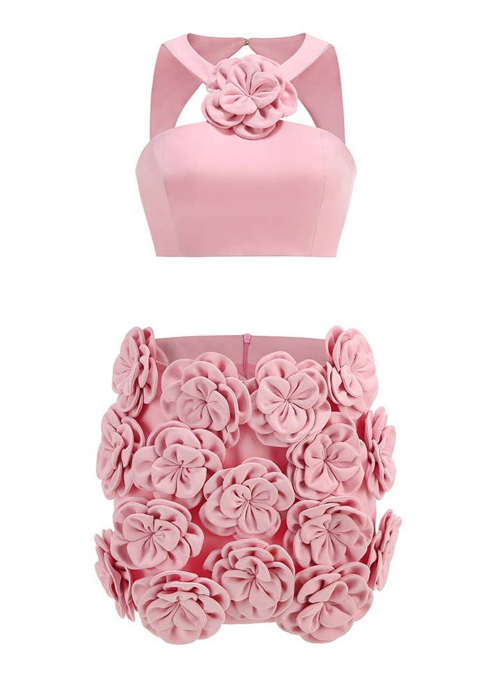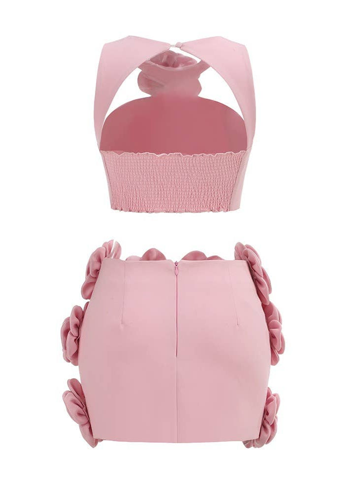This stunning two-piece set features a handmade flower top with a halter neck design and a matching short skirt adorned with intricate floral appliqués. The top is a sleek, fitted crop style, while the skirt is embellished with numerous three-dimensional flowers, creating a unique and eye-catching look. Perfect for special occasions, this set combines elegance and femininity, making it a standout addition to any wardrobe. The soft pink color adds a touch of romance, and the high-quality craftsmanship ensures a comfortable and flattering fit. Ideal for those who want to make a bold fashion statement.
