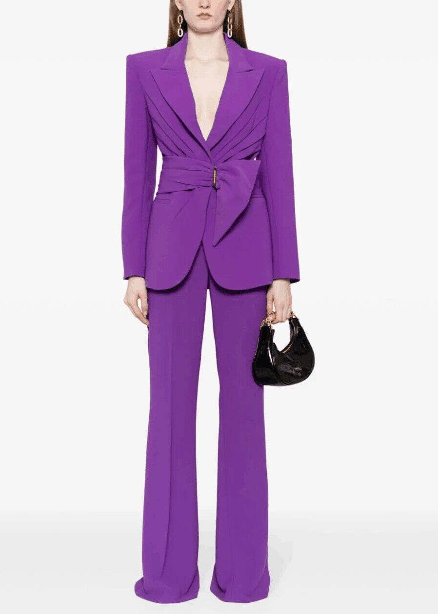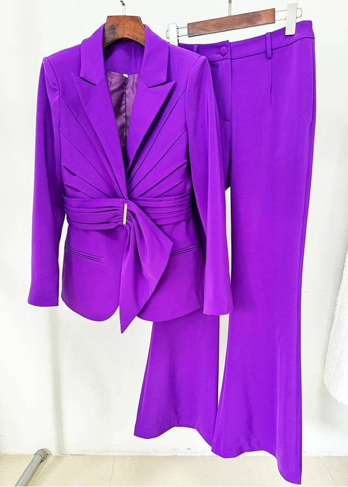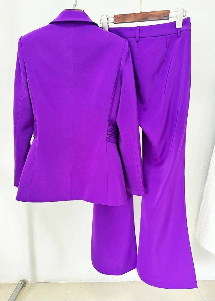 A Lisa Dean Exclusive || Dive into the world of sophistication with the Priscilla Slim Fit Blazer Pants Suit. Tailored to perfection, this ensemble promises a flattering fit, ensuring you make a statement wherever you go. The vibrant purple hue is a testament to uniqueness, designed for the modern woman who is bold and confident. The blazer boasts an irregular belt that accentuates the waistline, paired with slim-fit pants that offer comfort without compromising style.