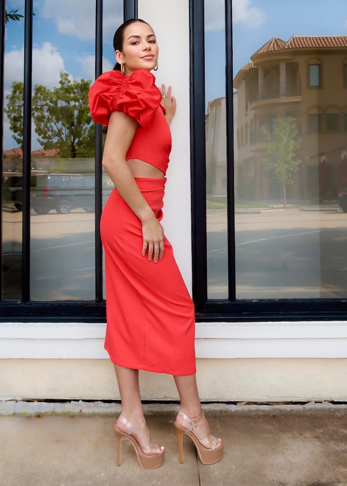 Wedding and event guest dress in bioelastic fabric combined with taffeta. Cut-out detail at the waist. Taffeta sleeves with draping and adjustable rubber Invisible zipper on the back. It has an inner lining.