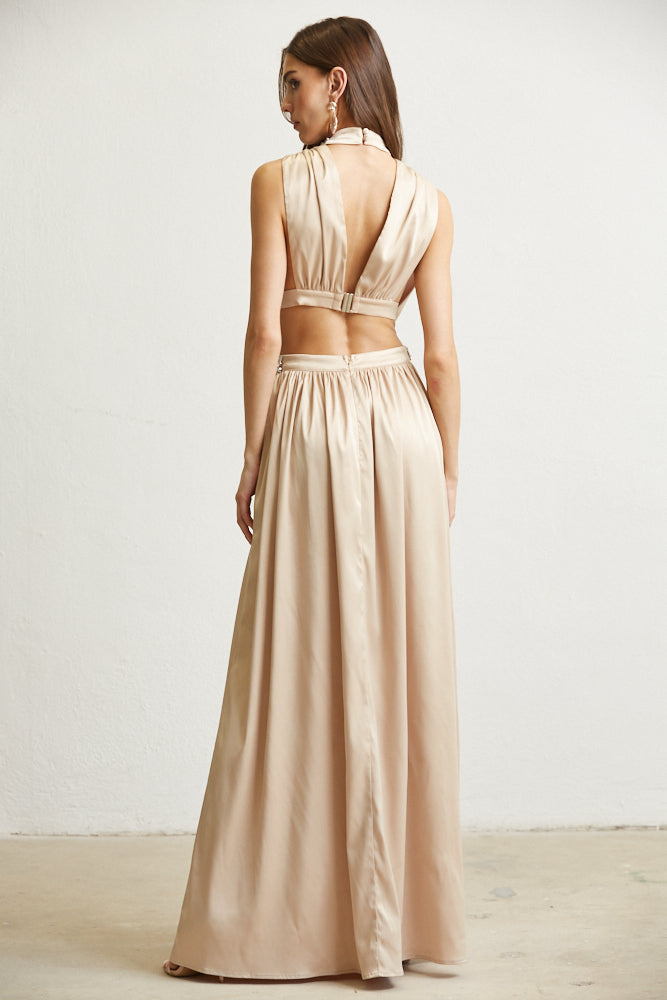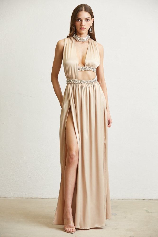 The Athena is a stunning champagne gold satin full length dress featuring layered cutouts, side slit, and rhinestone embellishments.