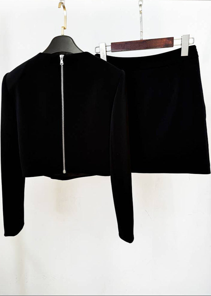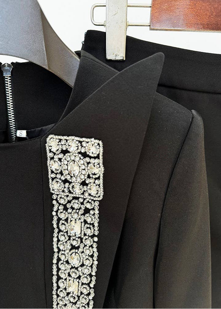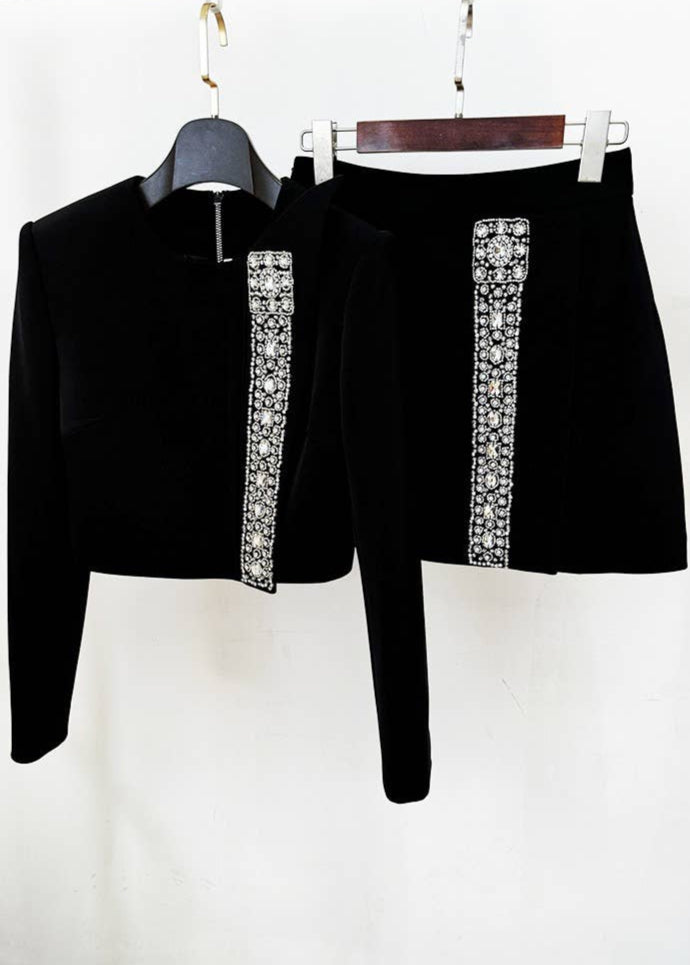 A Lisa Dean Exclusive || This exquisite two-piece set features a heavily beaded diamond top with a single collar and a matching skirt. The top is adorned with intricate beadwork and sparkling diamonds, creating a glamorous and eye-catching look. The skirt complements the top with its sleek and elegant design, making this set perfect for special occasions or sophisticated evenings out. Crafted from high-quality materials, this set ensures both comfort and style. The attention to detail and luxurious embellishments make it a standout addition to any wardrobe.