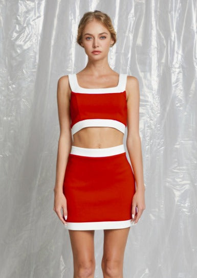 Game Day here we come! The Sideline Contrast Set in Crimson & White is perfect for cheering on your home team! It's soft like cotton and constructed like scuba! This lined set has a hook-and-eye/invisible zipper closure on the skirt and a silver zipper detail on the back of the top!