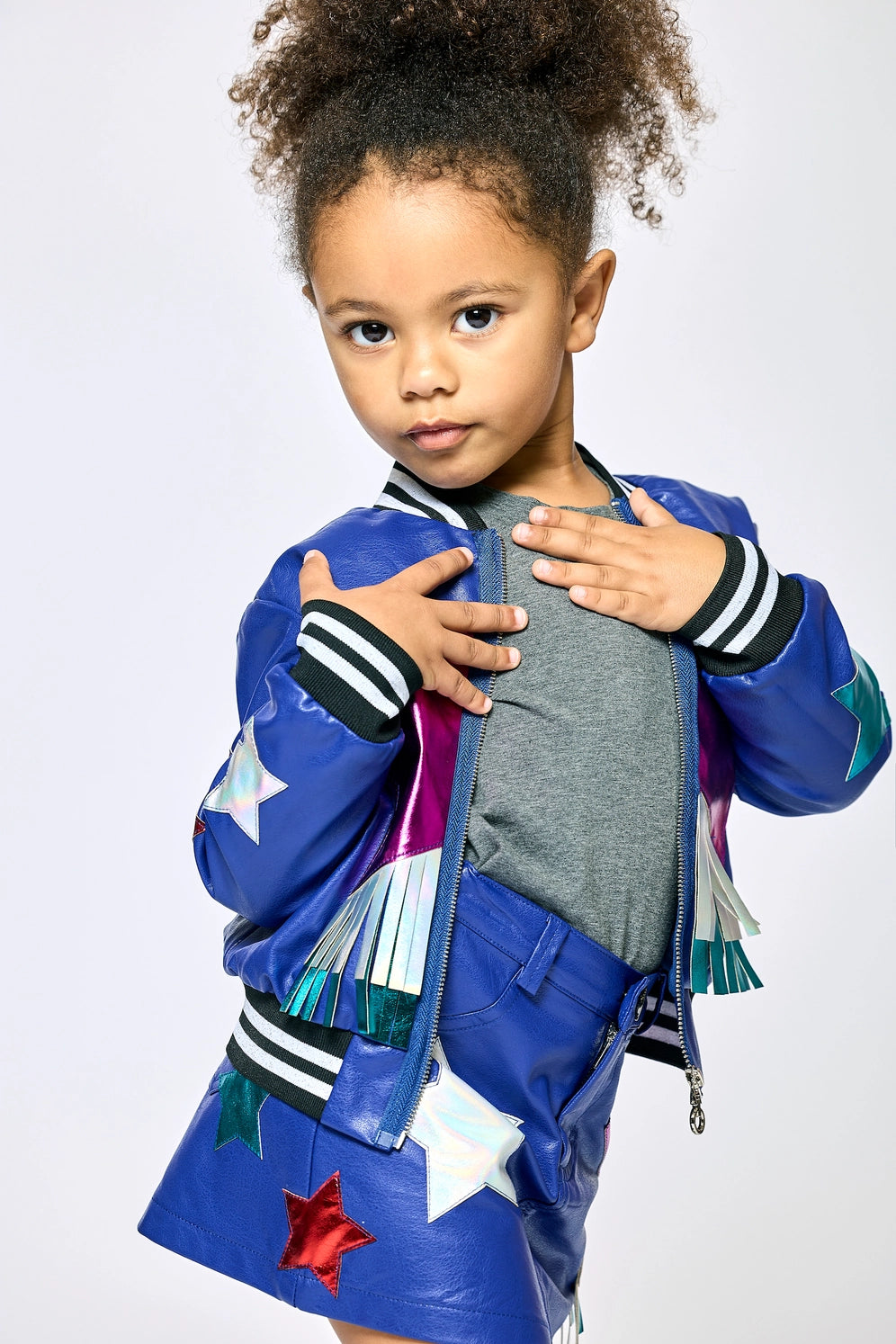 This skirt is the perfect fun fringe skirt! Pair it with the star leather jacket for the complete set! Fastened with a front zipper and button and an elastic waistband for your little rockstar to perform all day!