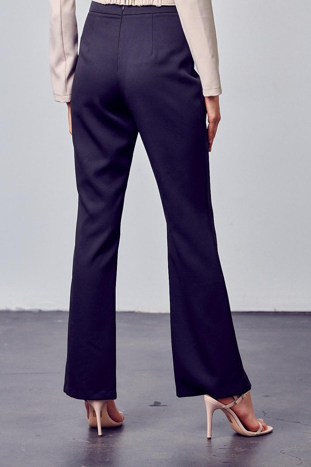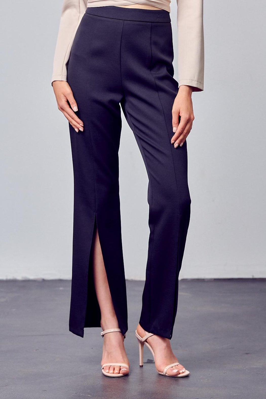 The perfect addition to a capsule wardrobe! These sleek tailored black trousers are complete with a front slit up the shin and hook-and-eye/invisible zipper closure on the back.