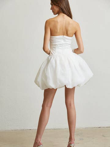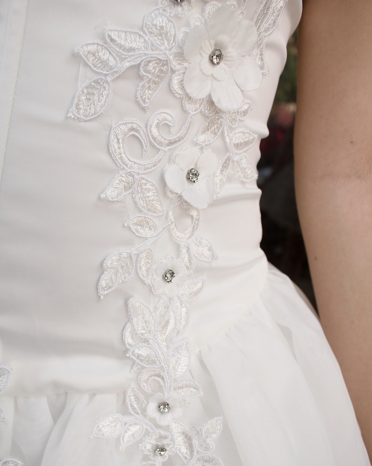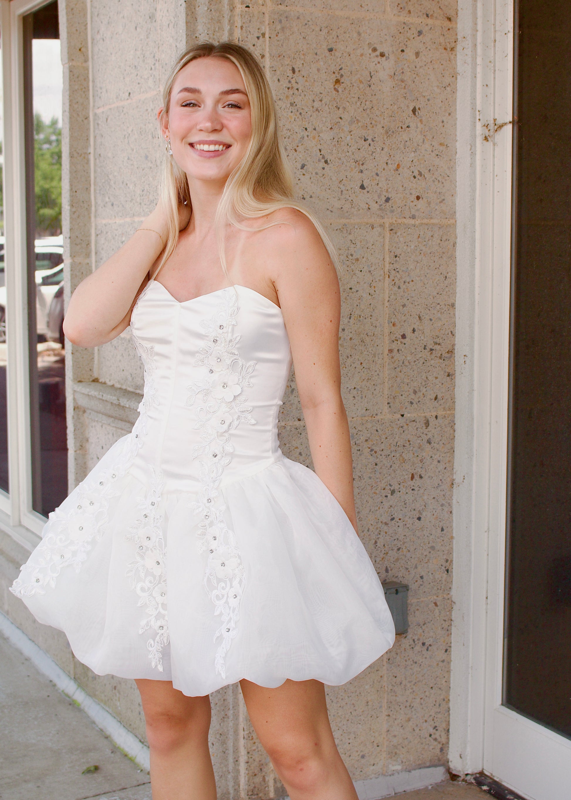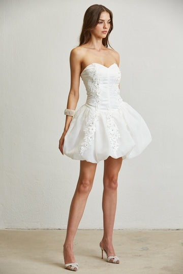 This satin & organza mini is one of our favorites! The sweetheart bustline has a silicone grip, the satin bodice has boning, and both the bodice and organza bubble skirt are complimented by a leaf embroidered pattern with 3D flower appliques.