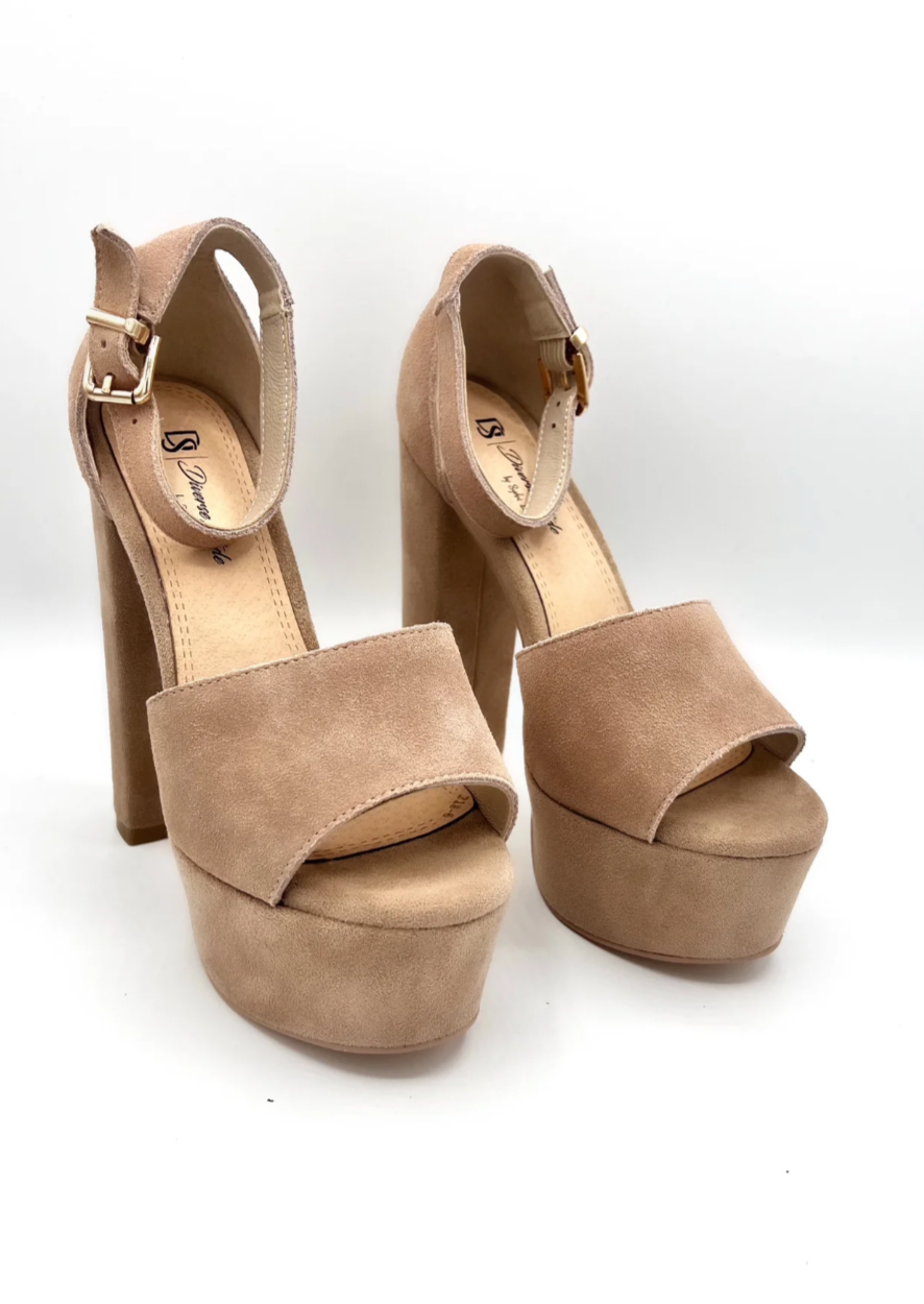 Genuine suede - light nude - wide heel with 1 1/2 inch platform, shoe is 6 1/2 inch in height, cushioned to feel like walking on pillows - True to size