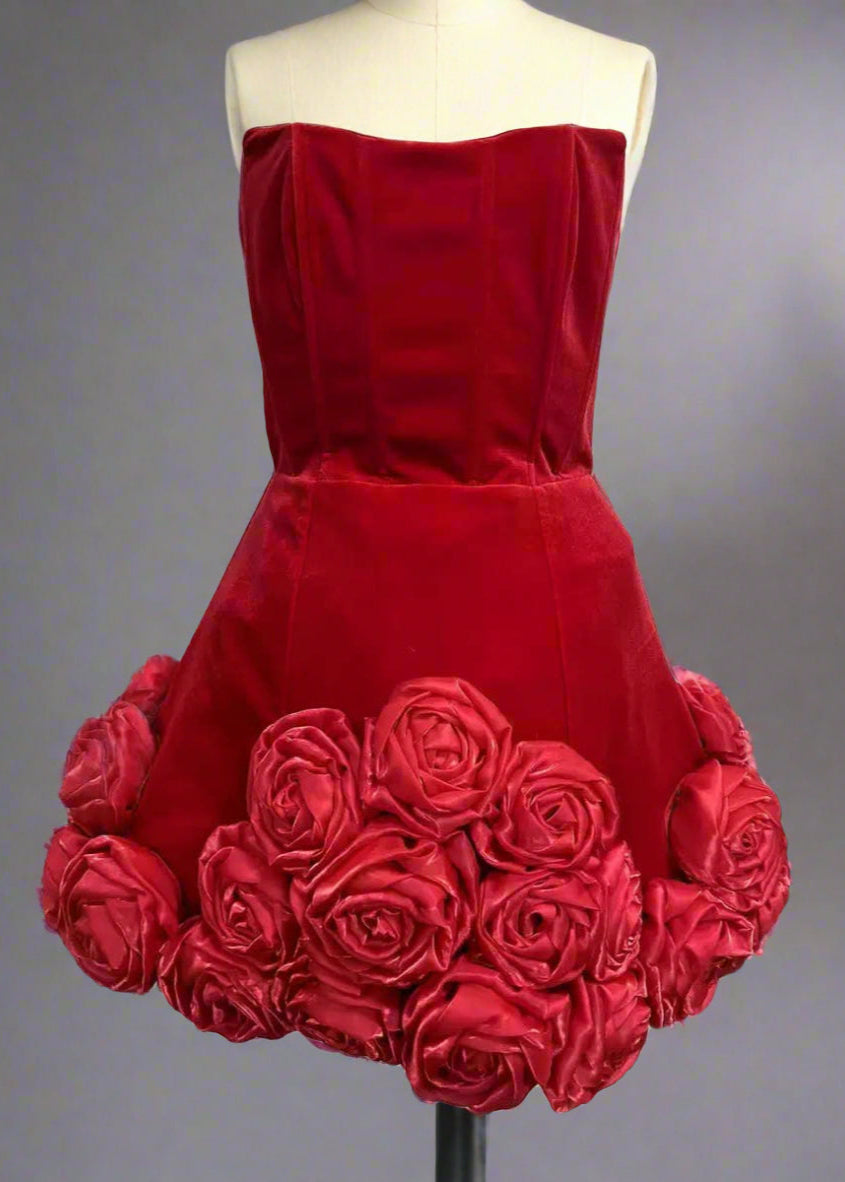 Lisa Dean Exclusive || Make a bold statement with this exquisite tube top dress that combines modern elegance with artistic design. The strapless silhouette beautifully accentuates the shoulders, while sleek velvet provides a timeless look. The standout feature is the three-dimensional rosette accents along the hemline. This dress is designed to turn heads! Crafted with high-quality materials, it ensures a comfortable fit while maintaining its luxurious appeal.Â