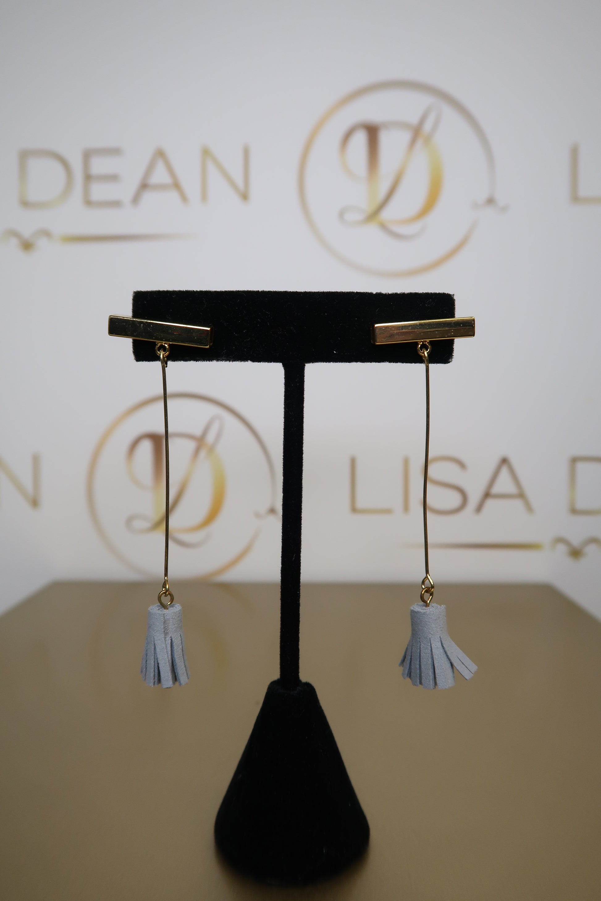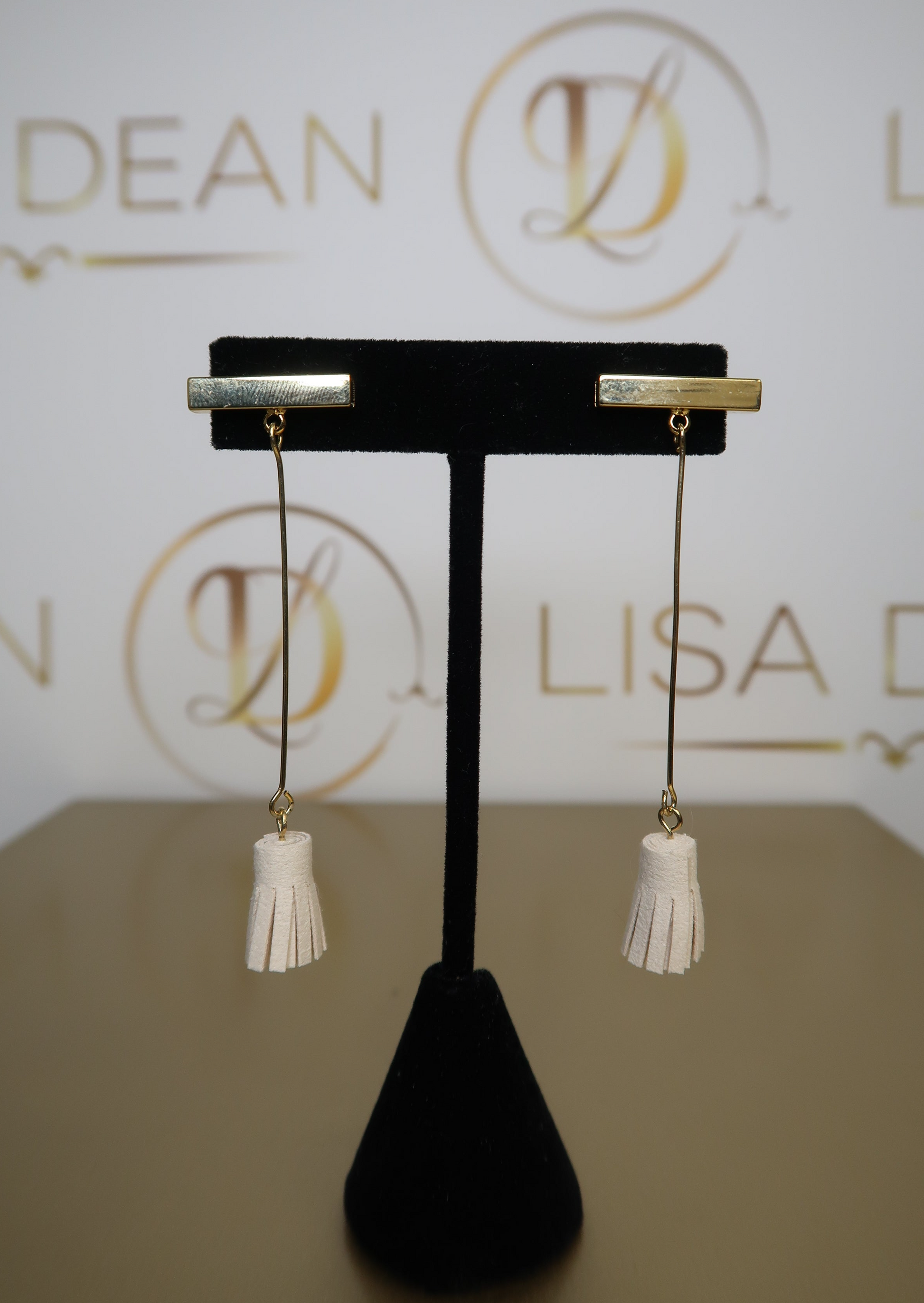 These gold drop earrings feature a suede beige or gray tassel. They have a post backing.