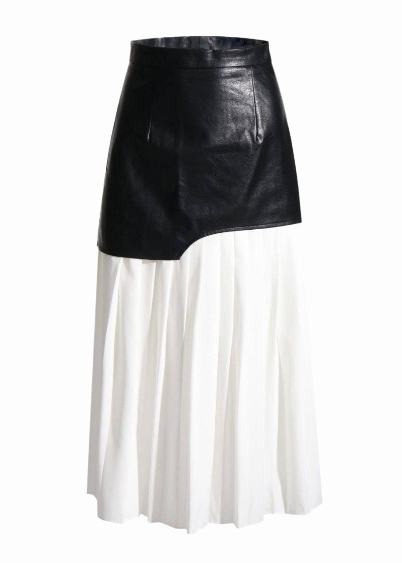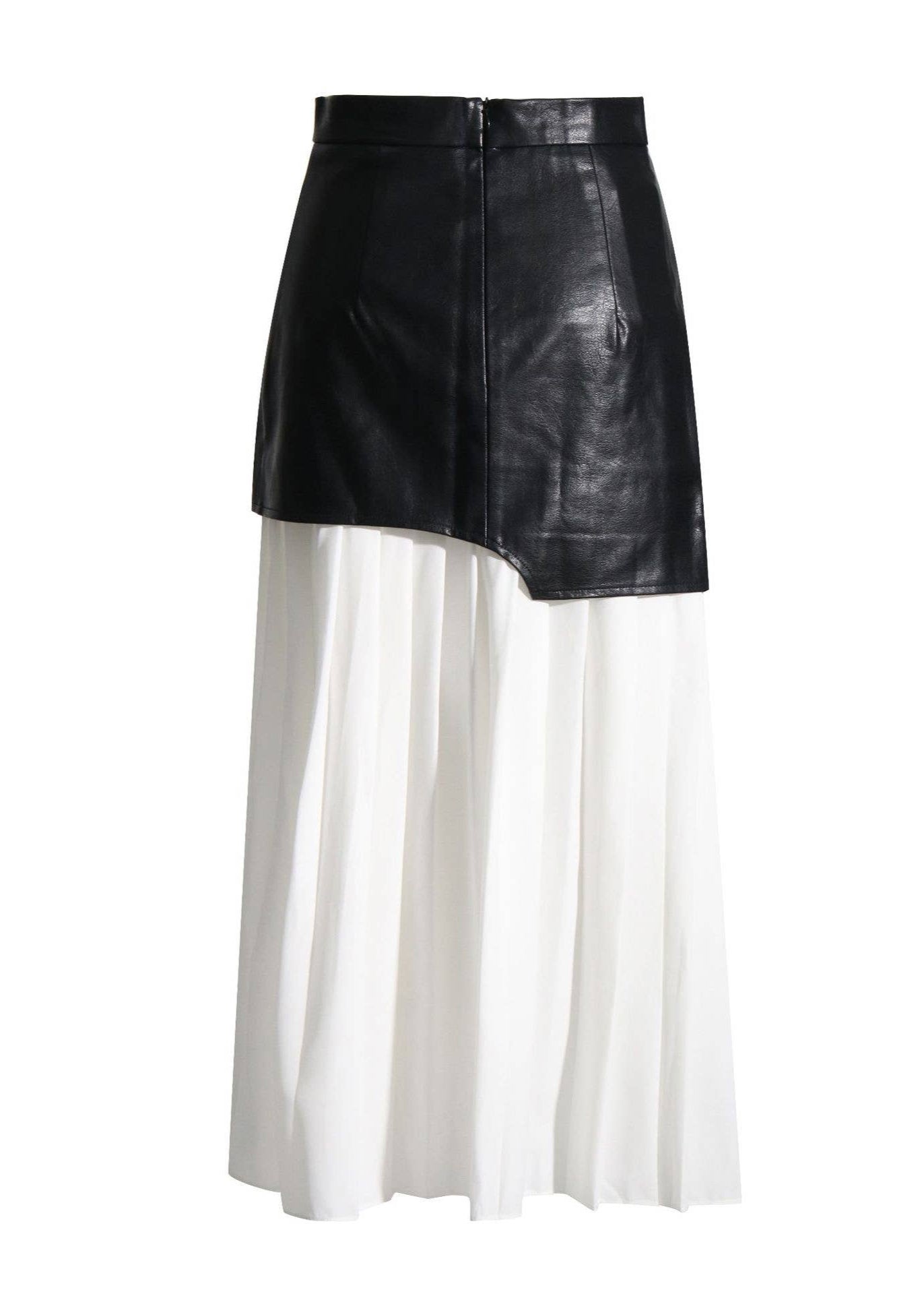The high-waisted design, crafted from premium PU leather, exudes sophistication, while the pleated lower half adds a playful, feminine touch. This skirt’s contrasting textures and colors make it a versatile piece that can transition seamlessly from day to night. Its mid-length cut ensures comfort and style, making it perfect for the fashion-conscious individual. Ideal for your online wholesale business, this skirt promises to be a standout item that appeals to customers looking for unique, trendsetting apparel.