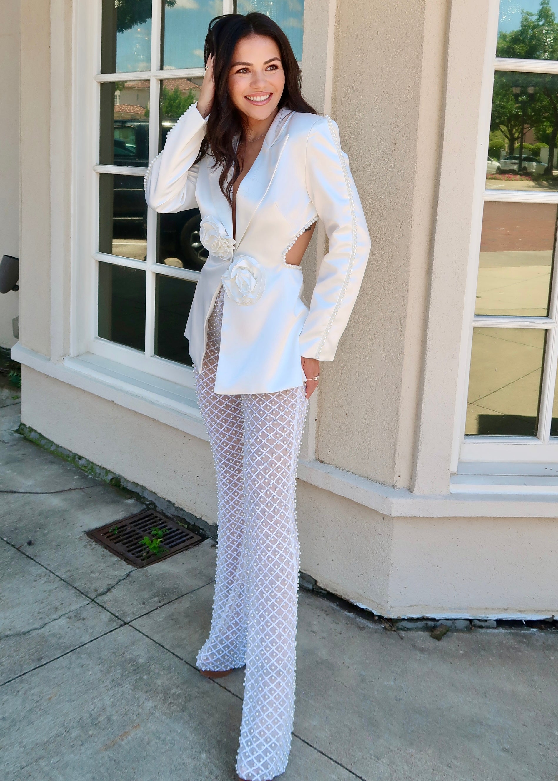Illusion beaded mesh unlined pants with a satin suit top and cut out low back!