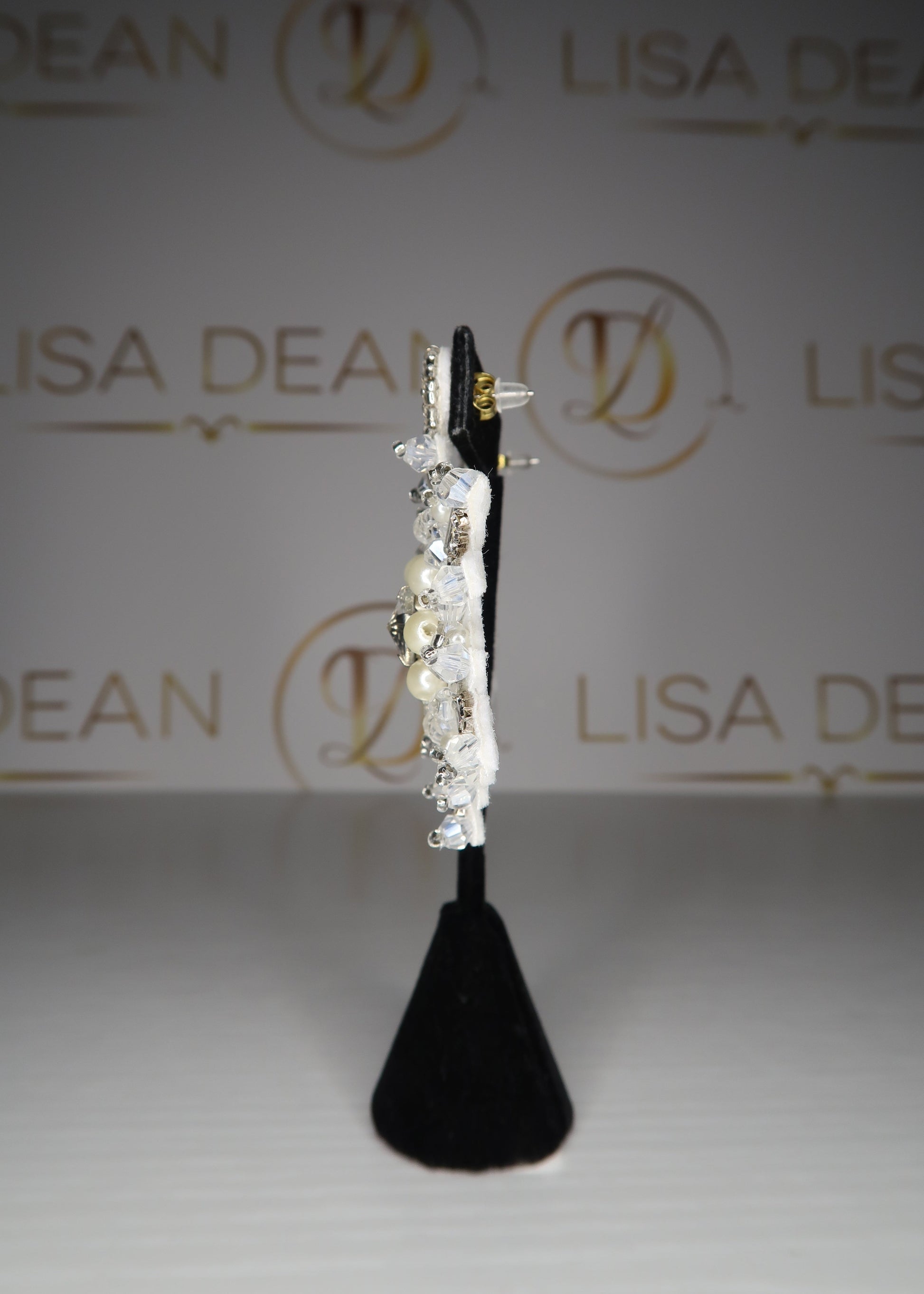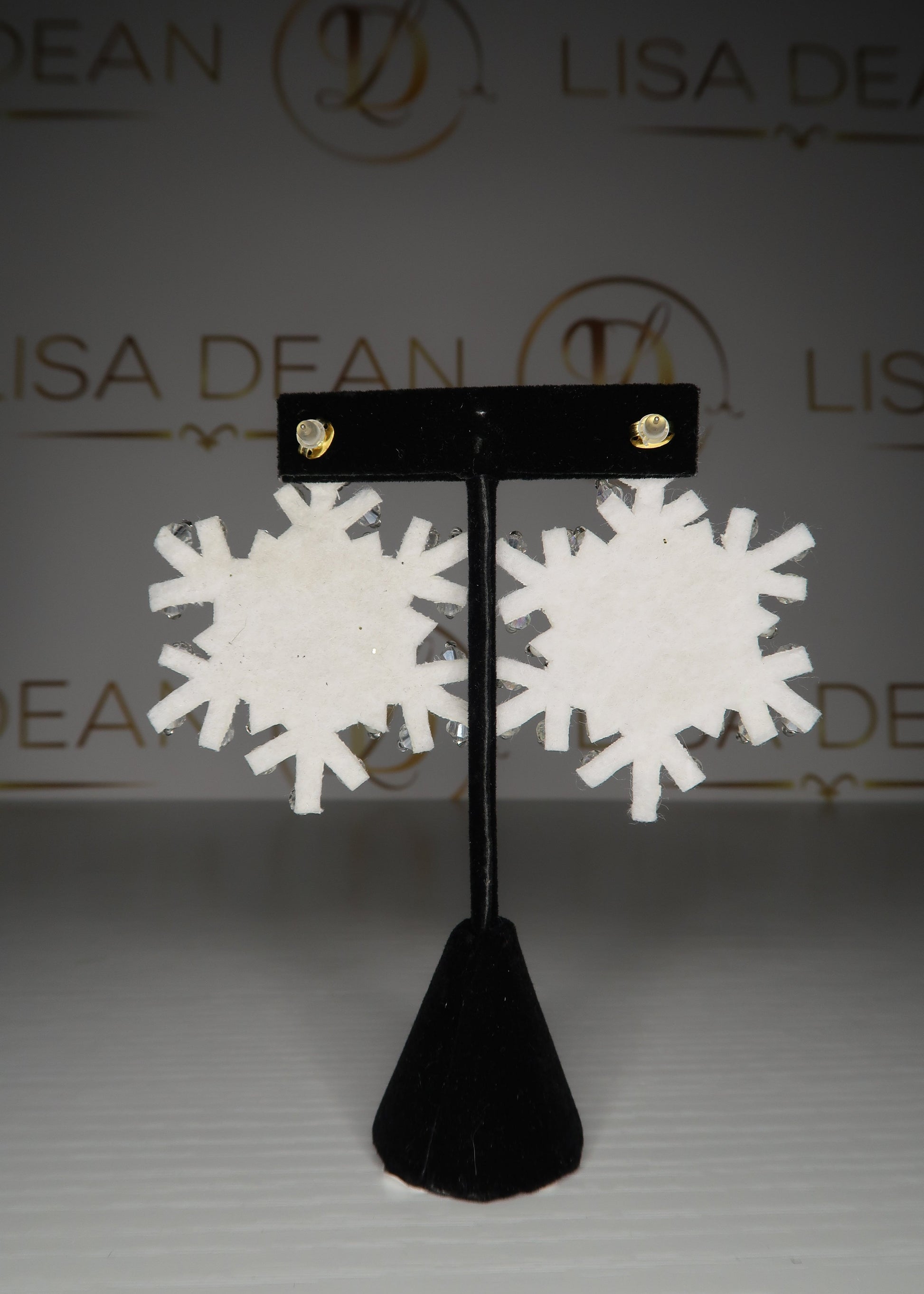As fresh as fallen snow these lightweight, felt backed, post earrings featuring glass beads, rhinestones, and pearls! Approx. 2.5" in length and 2" wide.